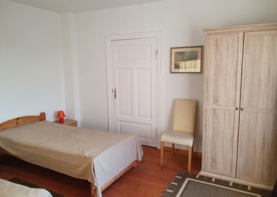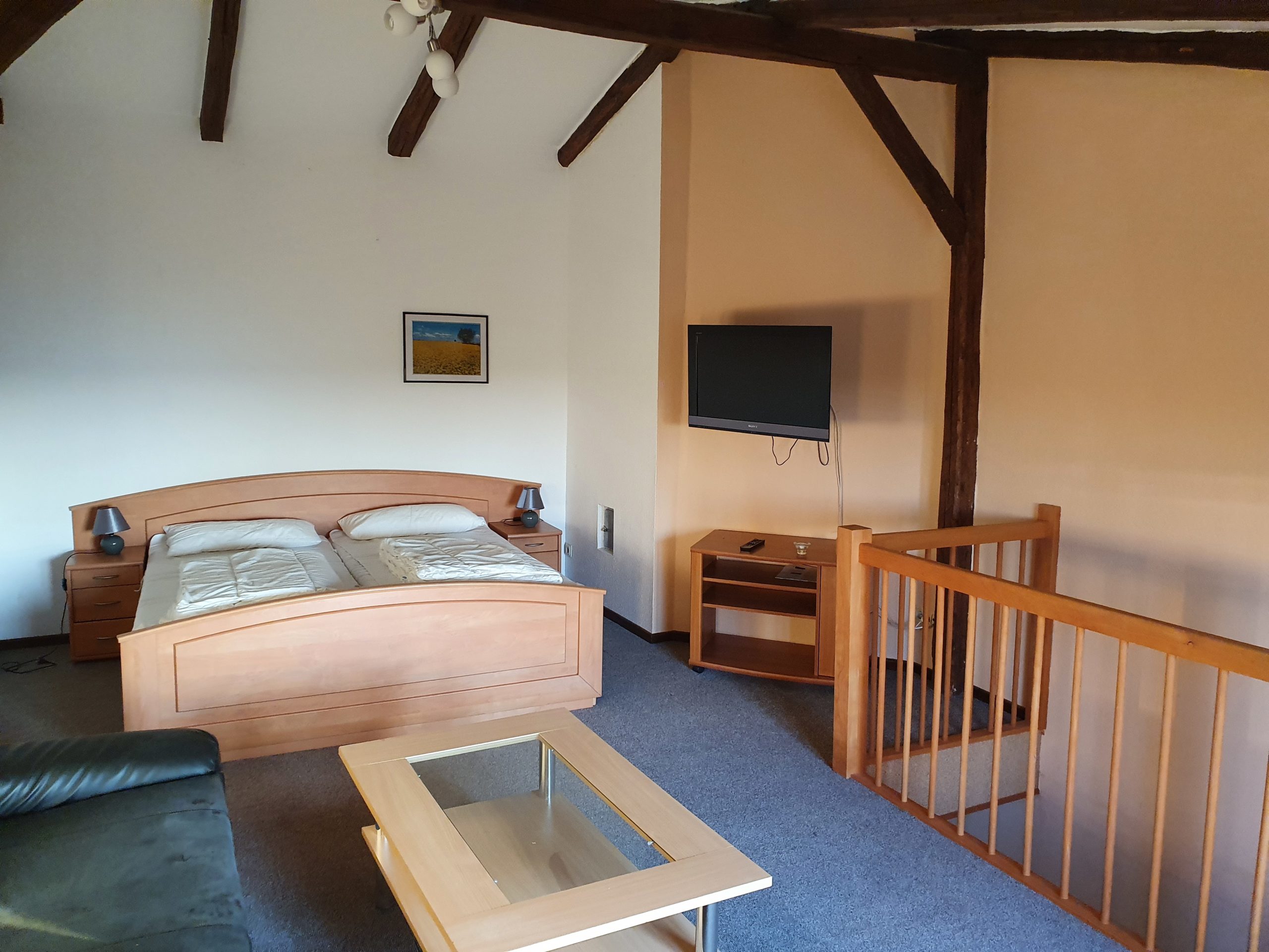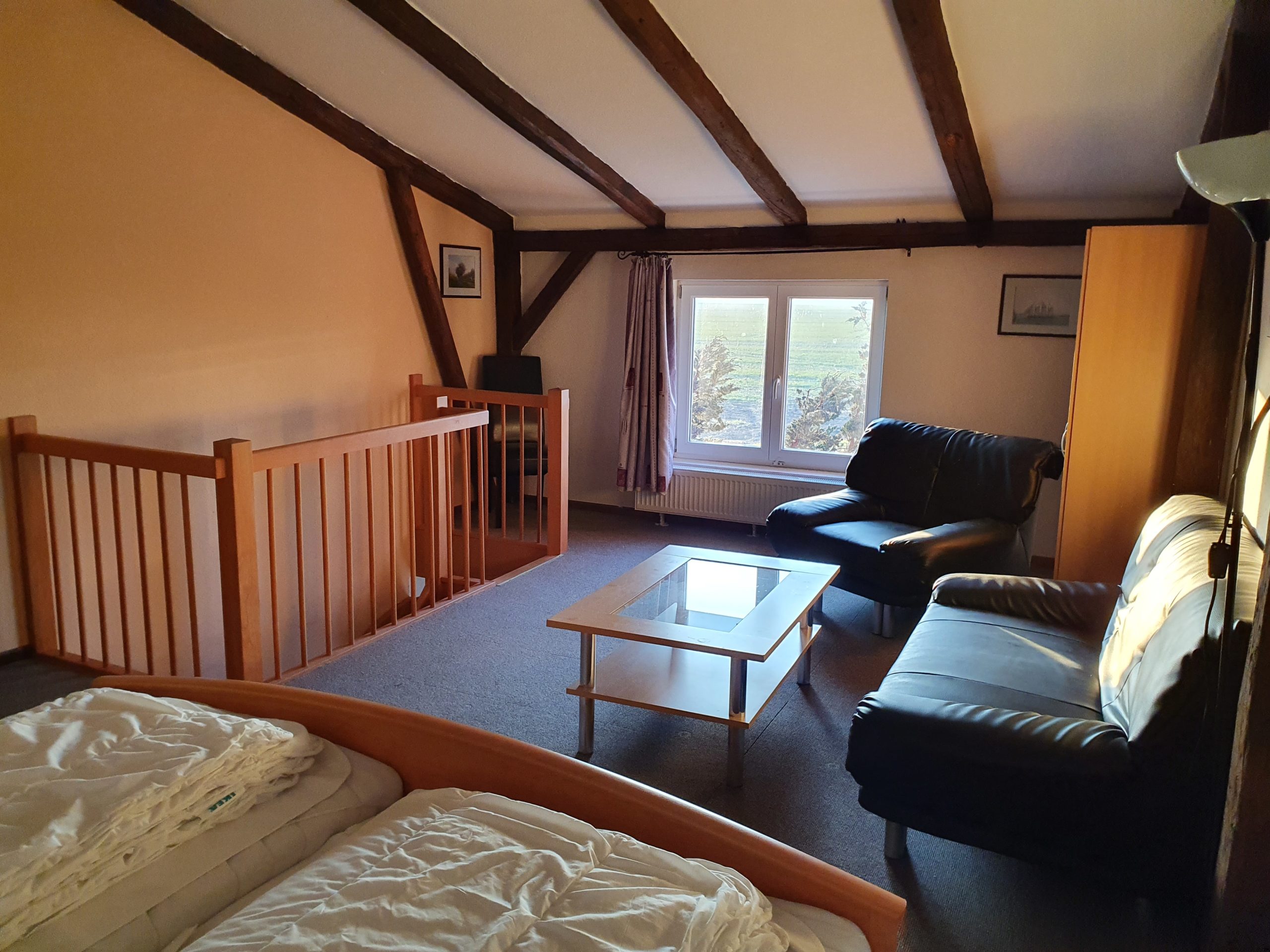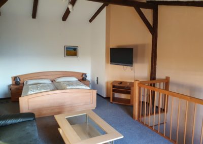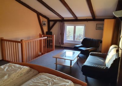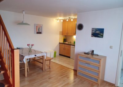 Die Ferienwohnung ist eine Wohnung über 2 Etagen. Das Erdgeschoss unterteilt sich in eine kleine Wohnküche mit Küchenzeile und Essecke, 1 Schlafzimmer (2 Einzelbetten) sowie ein Badezimmer (Dusche/WC) ohne Fenster. Das Obergeschoss ist gestaltet als kombiniertes Wohn- und Schlafzimmer (1x Doppelbett). Im kombinierten Wohn- und Schlafzimmer finden Sie ein TV-Gerät. Ein Gästezugang zum WLAN ist vorhanden.