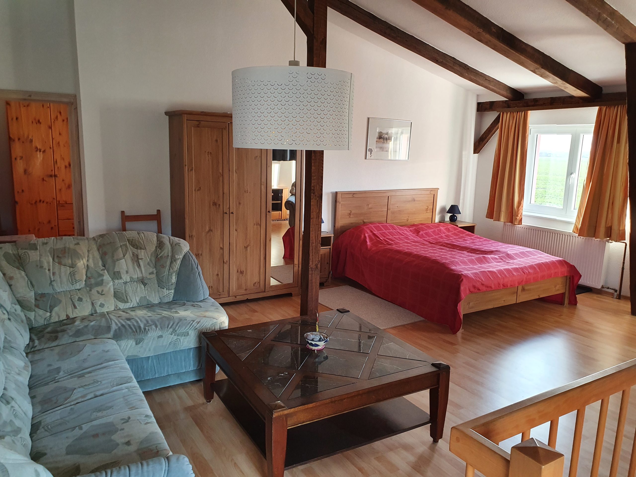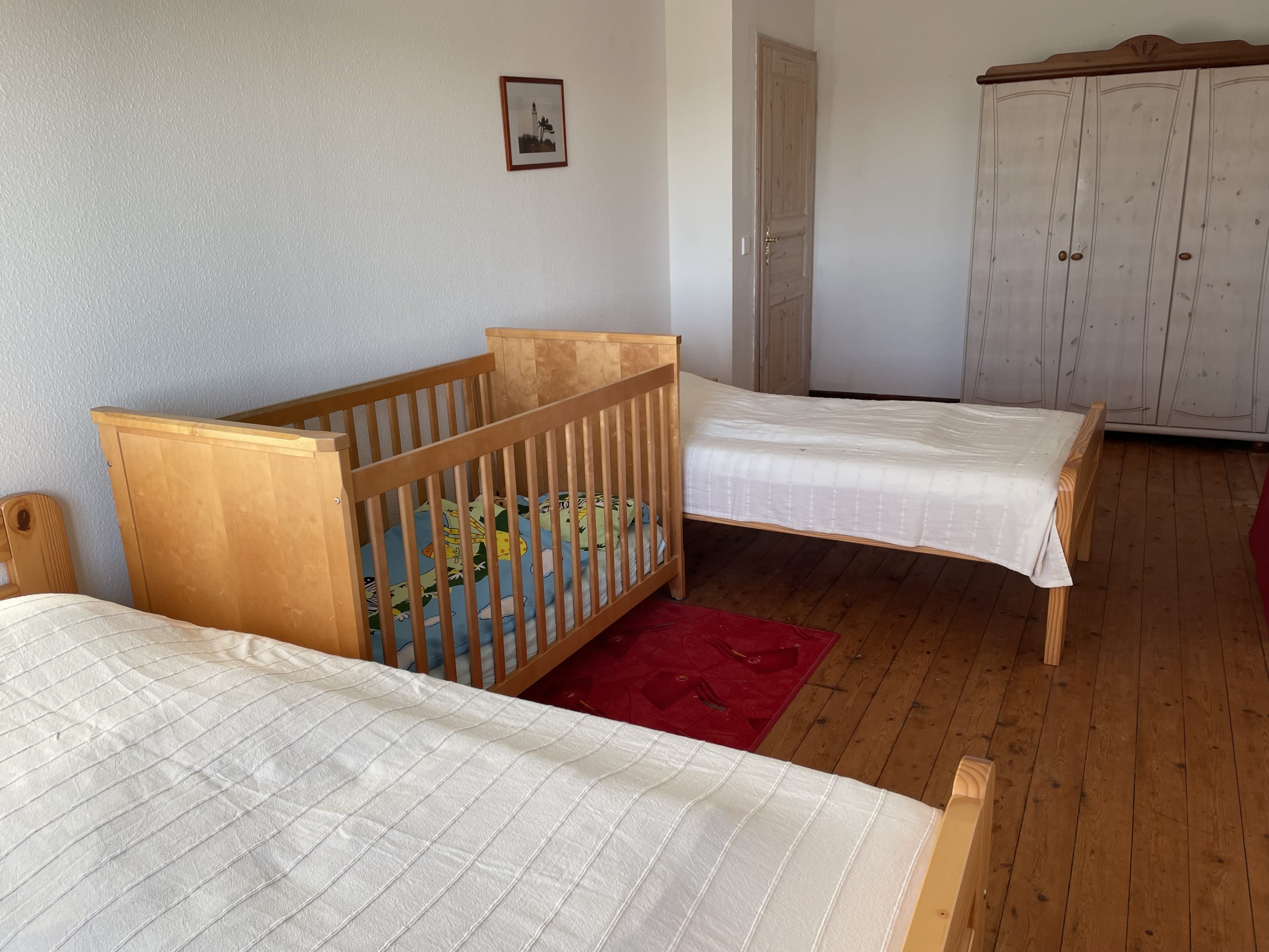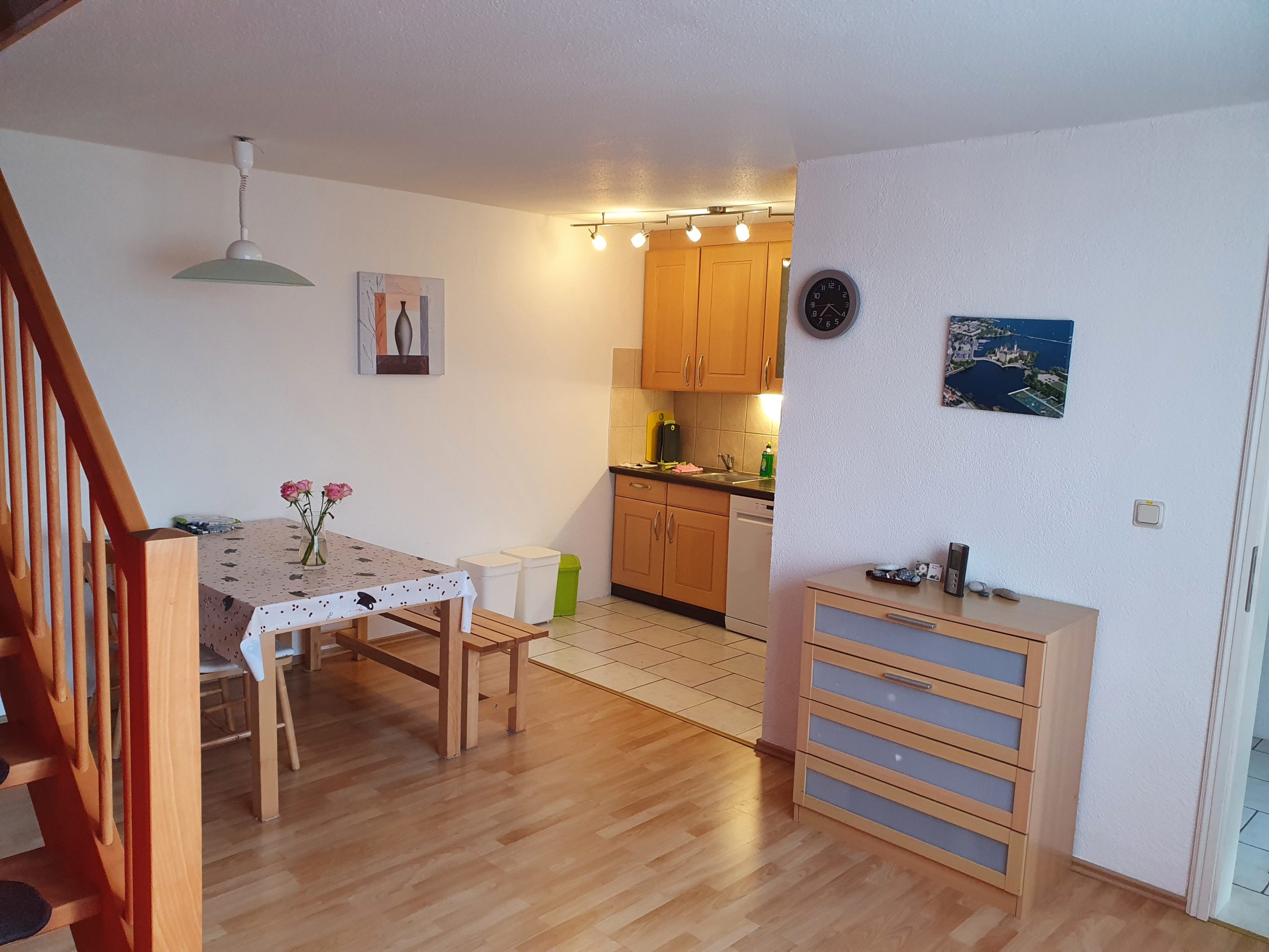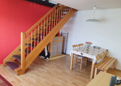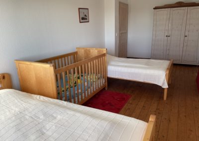 Die Ferienwohnung ist eine Wohnung über 2 Etagen. Das Erdgeschoss unterteilt sich in eine Wohnküche, einen kleinen Flur und ein Badezimmer mit Fenster (Dusche/WC). Im Obergeschoss befinden sich ein kombiniertes Wohn- und Schlafzimmer (1x Doppelbett) und ein separates Schlafzimmerer (2 x Einzelbetten sowie ein Babybett). Für unsere ganz kleinen Gäste ist auch ein Kinderstühlchen vorhanden. Im kombinierten Wohn- und Schlafzimmer finden Sie ein TV-Gerät. Ein Gästezugang zum WLAN ist vorhanden.