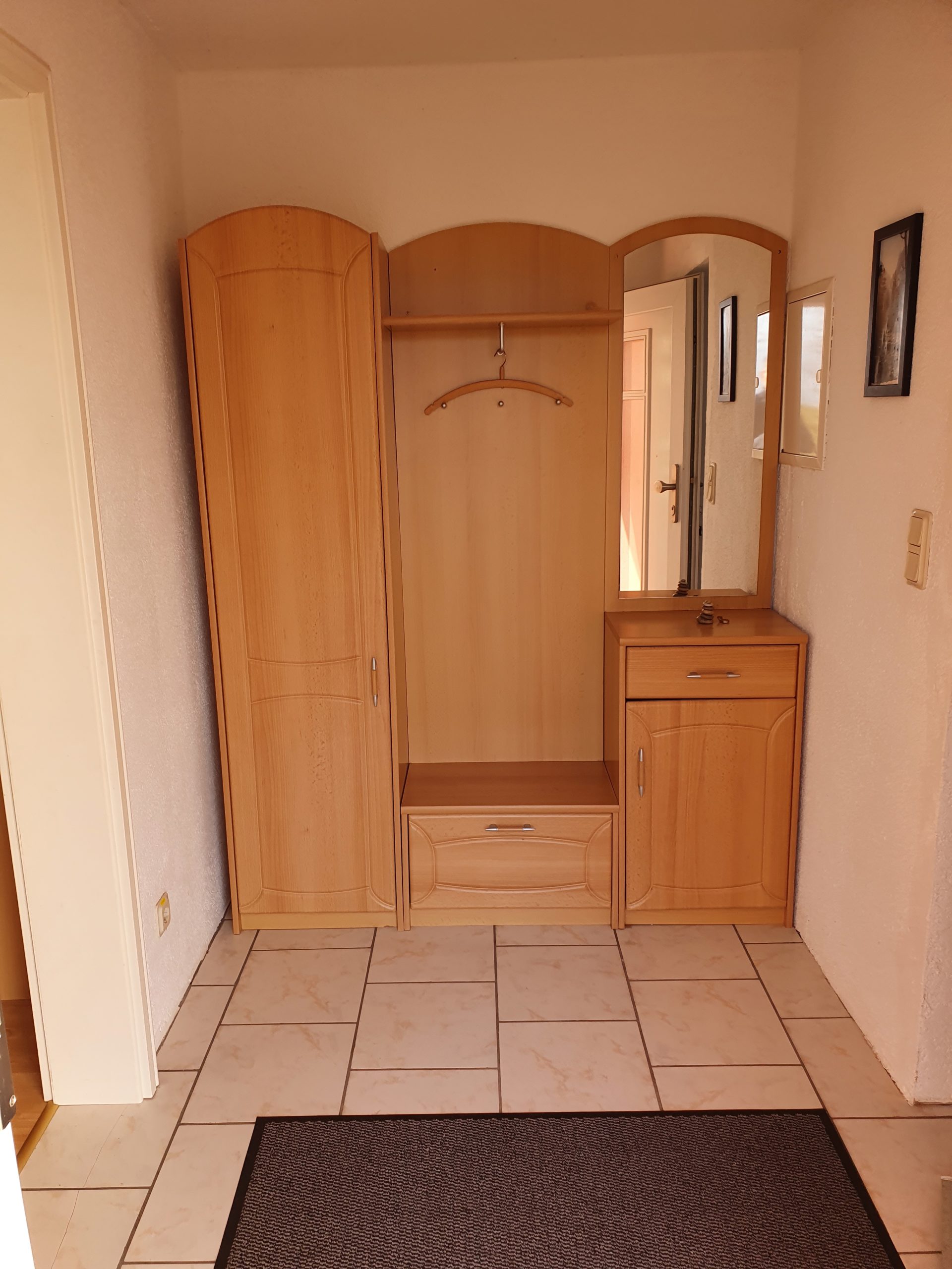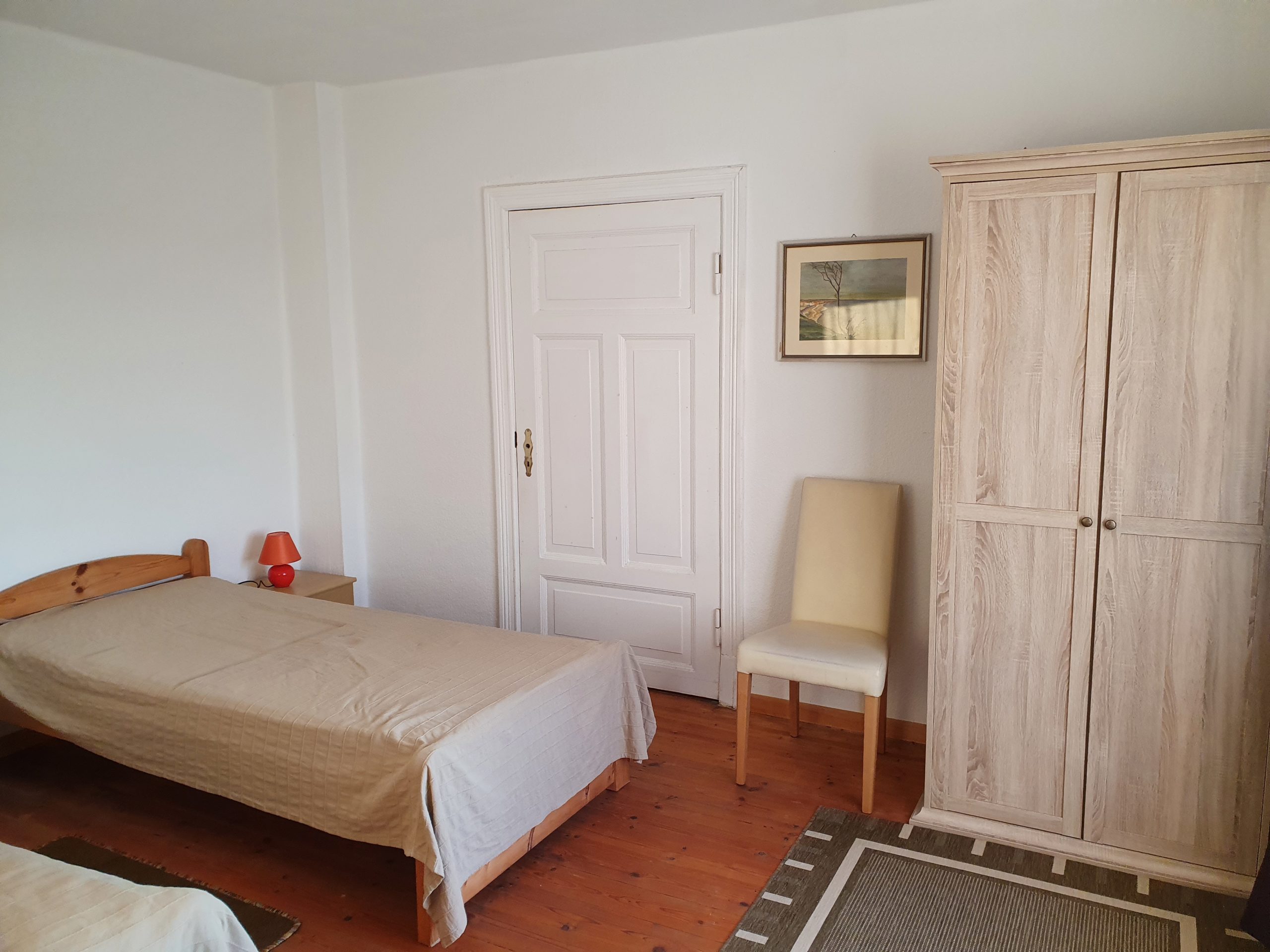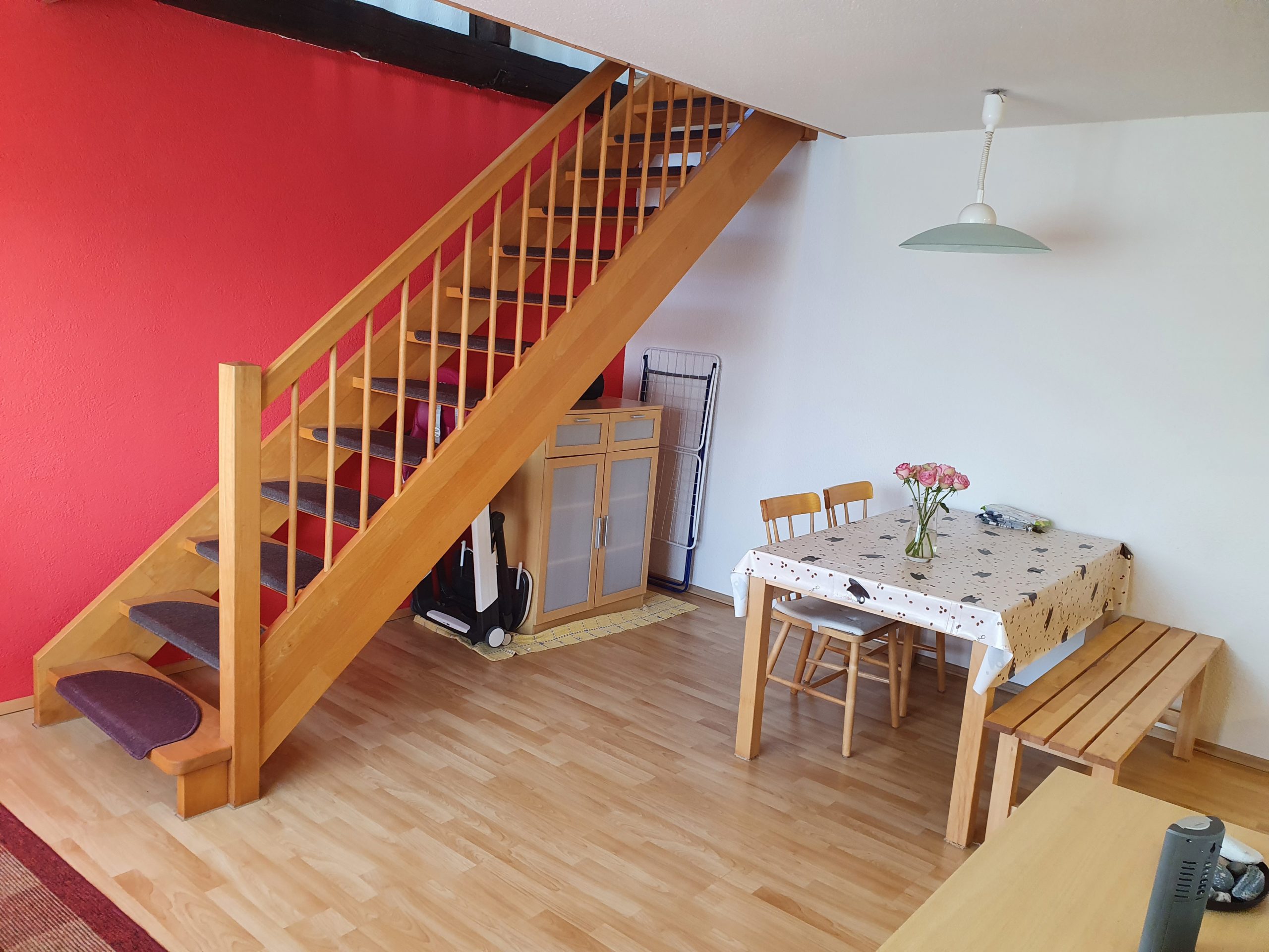 Die Ferienwohnung ist eine Wohnung über 2 Etagen. Das Erdgeschoss unterteilt sich in eine Wohnküche, einen kleinen Flur und ein Badezimmer mit Fenster (Dusche/WC). Im Obergeschoss befinden sich ein kombiniertes Wohn- und Schlafzimmer (1x Doppelbett) und ein separates Schlafzimmerer (2 x Einzelbetten sowie ein Babybett). Für unsere ganz kleinen Gäste ist auch ein Kinderstühlchen vorhanden. Im kombinierten Wohn- und Schlafzimmer finden Sie ein TV-Gerät. Ein Gästezugang zum WLAN ist vorhanden.