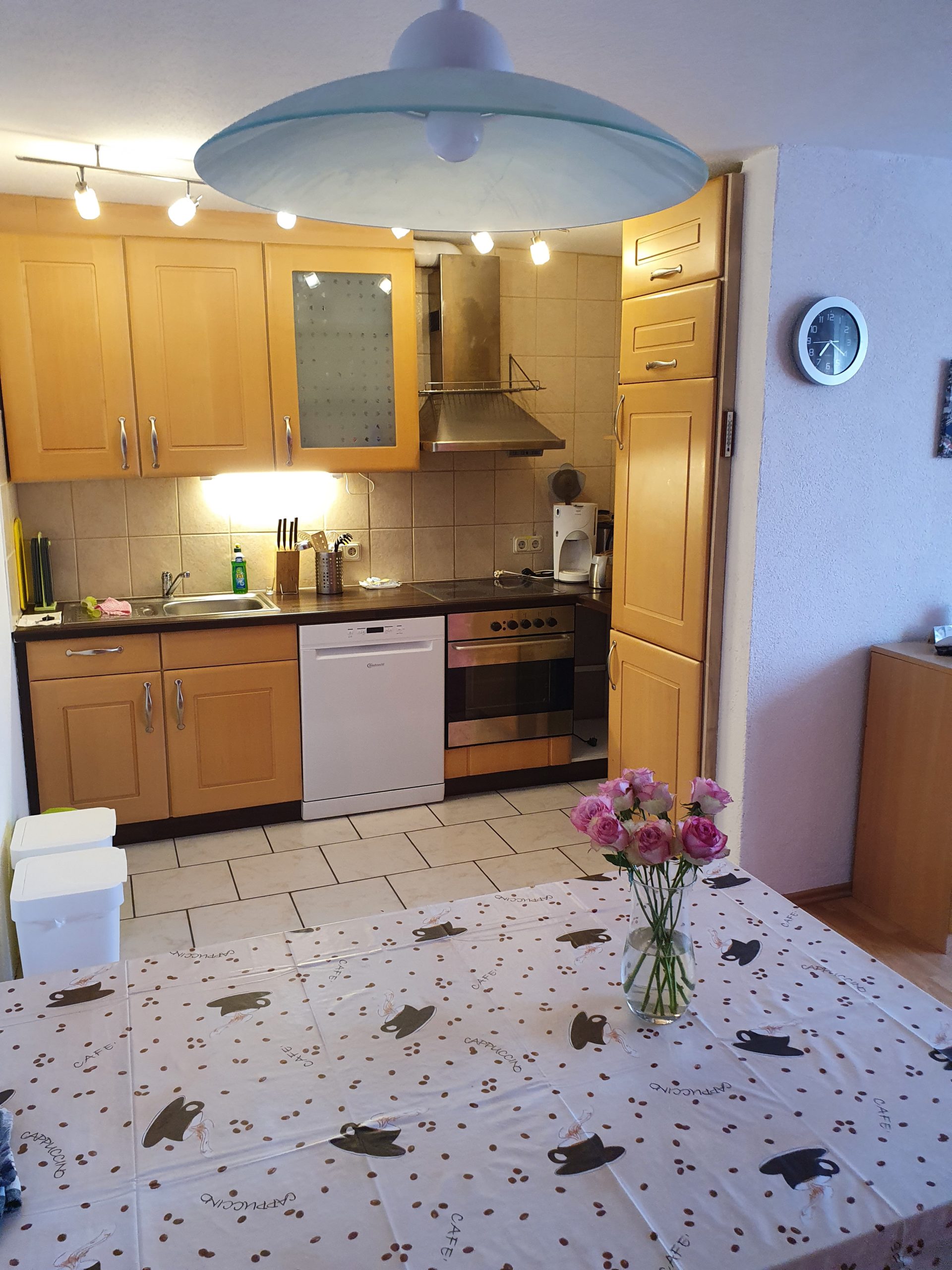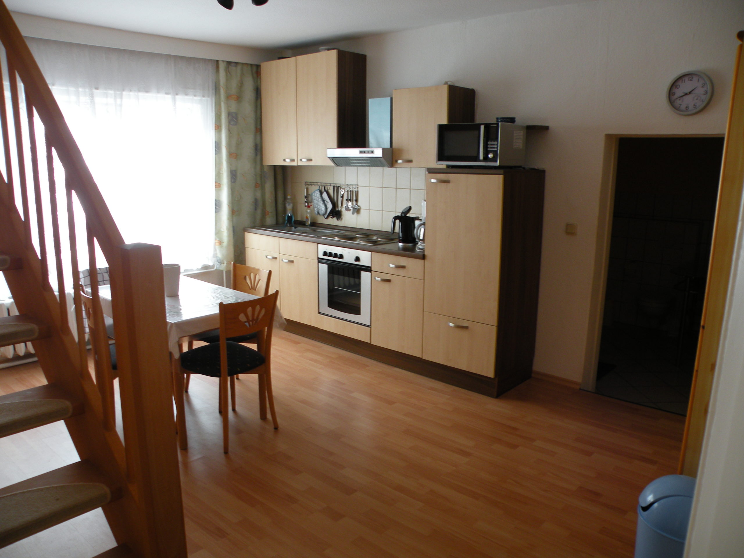 In der Wohnküche im Erdgeschoss befindet sich eine Einbauküche ausgestattet mit Elektroherd und Backofen, Kühlschrank (ohne Gefrierfach) sowie Geschirrspüler. Weiterhin finden Sie in der Küche die üblichen Küchengeräte wie Wasserkocher, Kaffeemaschine, Toaster, Mikrowelle sowie ausreichend Geschirr.